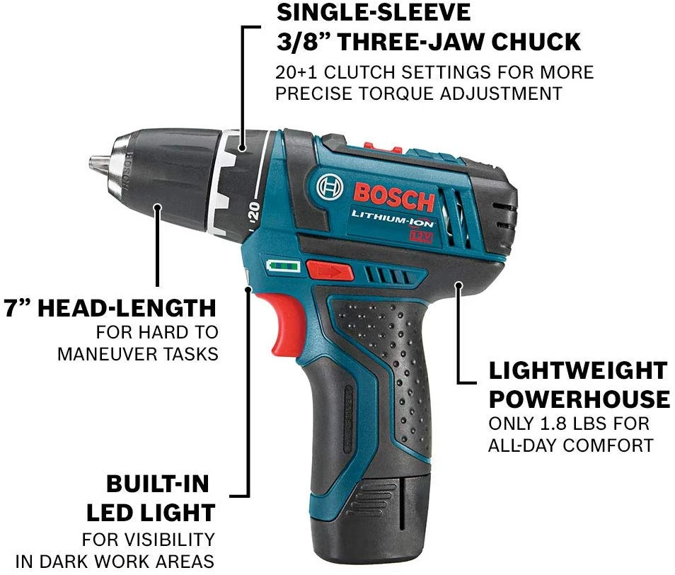 - POWER: This Bosch drill kit includes a powerful 12 volt drill driver with up to 1, 300 RPM and a 12 volt driver with up to 2, 600 RPM