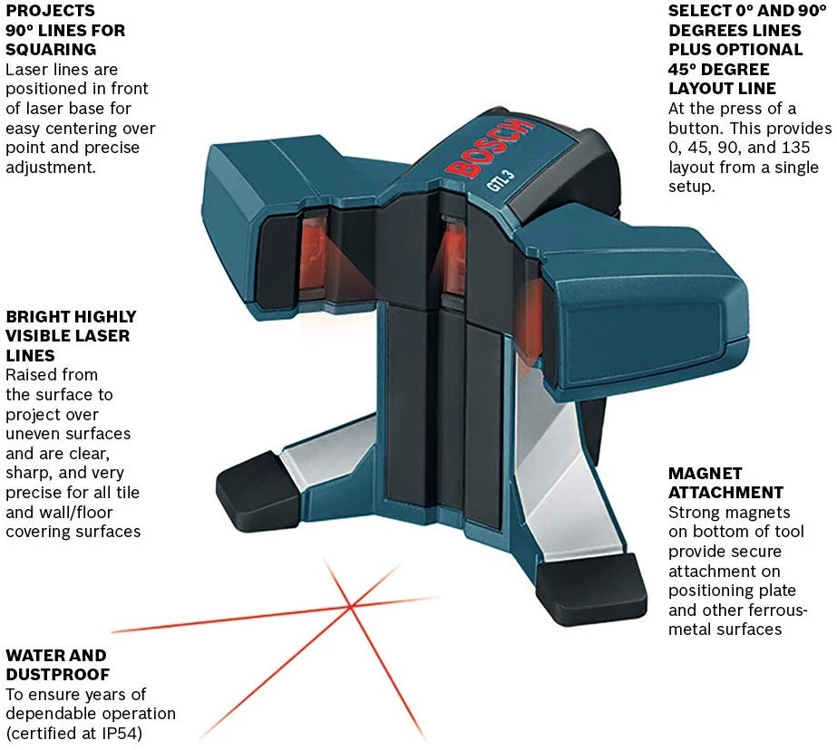 - PRECISION: Able to project 90 degree lines for squaring . The Bosch GTL3’s laser lines are positioned in front of laser base for easy centering over point and precise adjustment