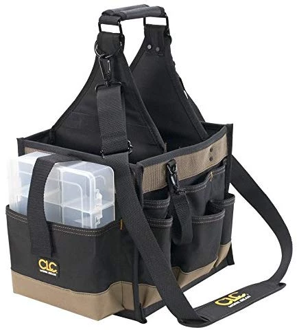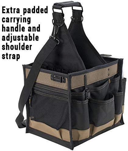 - Box-shaped design prevents tipping over, pockets for drill bits and tips, testers, pliers, screwdrivers, etc.