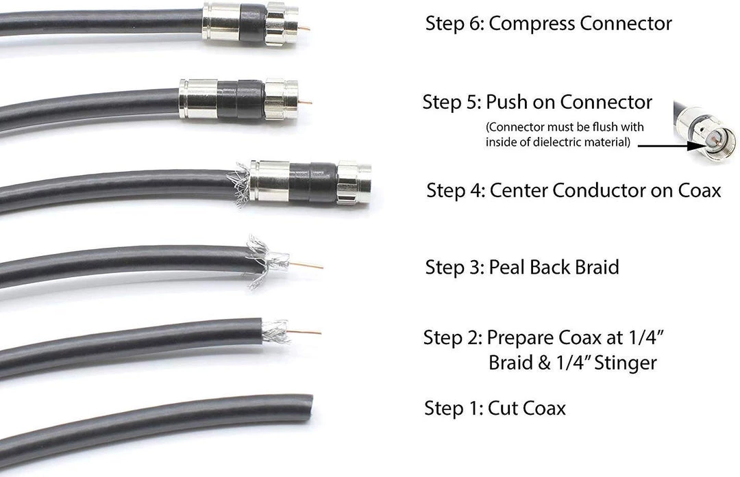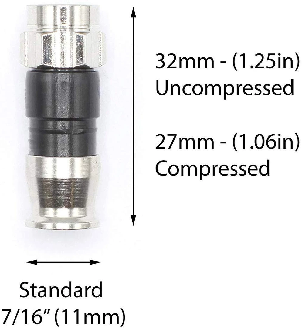 - Designed for standard ‘prepared coax tip’ of 1/4″ braid and 1/4″ exposed center conductor – use with any standard 21mm compression tool (THE CIMPLE CO tool is recommended, but not required)