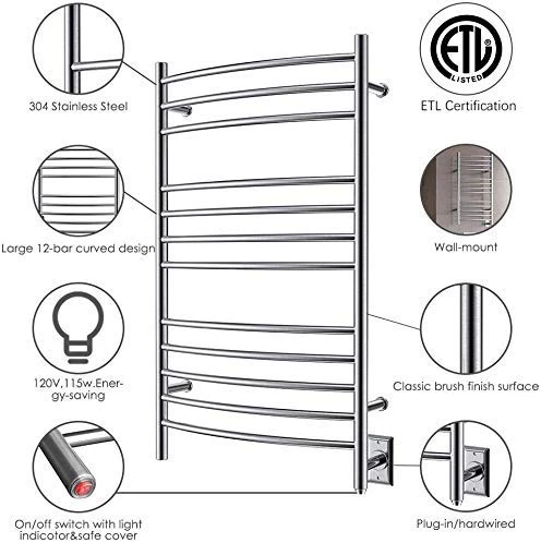 - LARGE 12-BAR CURVED DESIGN: This oversized HEATGENE towel warmer is perfect for family use. This sleek and functional towel warmer fits any decor. Its curved design is convenient for hanging towels and uses 12 bars to evenly distribute heat, warming up to 2 large towels or bathrobes. You can put multiple items on it at the same time as long as they don’t overlap. Perfect for having a cozy, warm towel ready when you and your family step out of the shower or bath