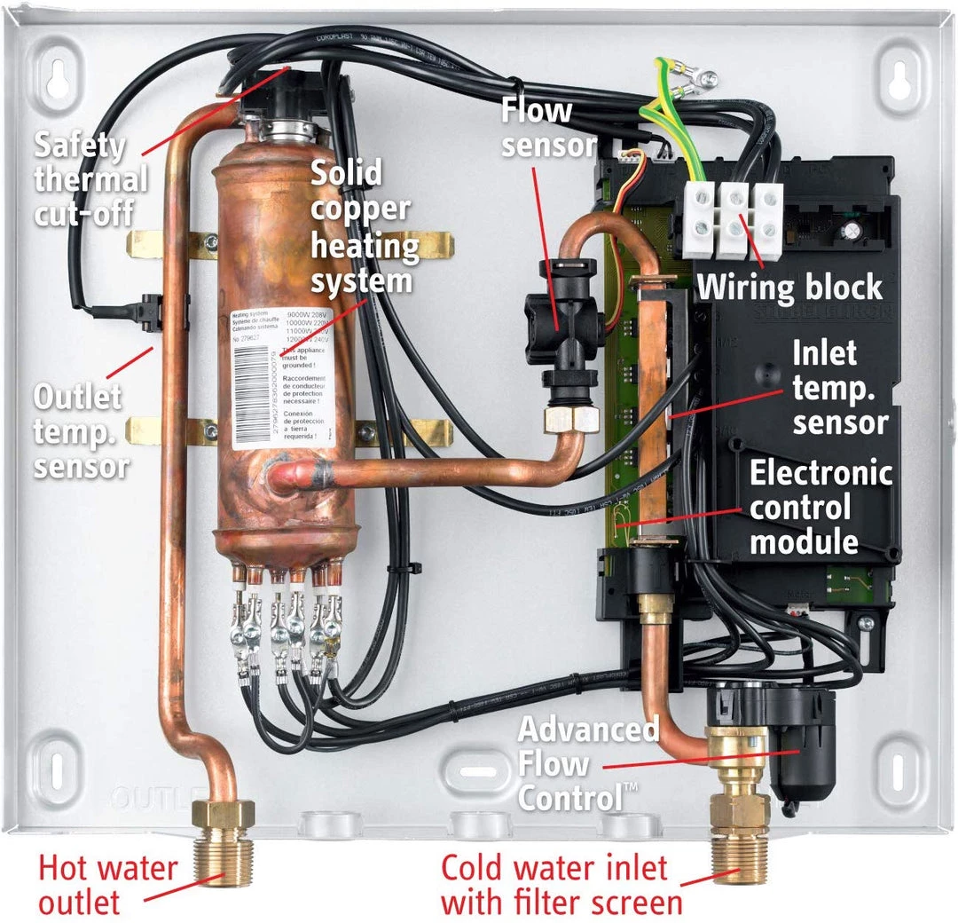 - CONTINUOUS FLOW – Advanced Flow Control German patented technology invented by Stiebel Eltron, automatically maintains water temperature for constant comfort. It’ll reduce flow slightly if hot water demand exceeds capacity. Hot showers will never be interrupted again.