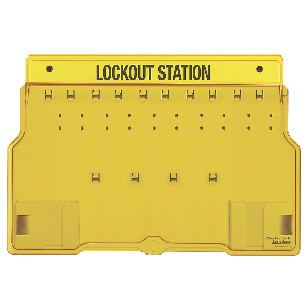 Safety lockout covered padlock station, allows up to 10 padlocks to be added. Constructed from resilient polycarbonate material to provide heat resistance and improved strength. Reinforced snap-on clips provide easy padlock and hasp storage and removal. Translucent cover protects contents and is lockable to prevent loss of valuable products.