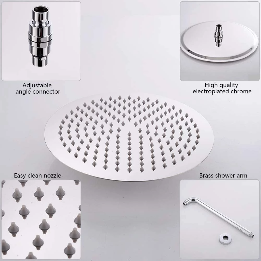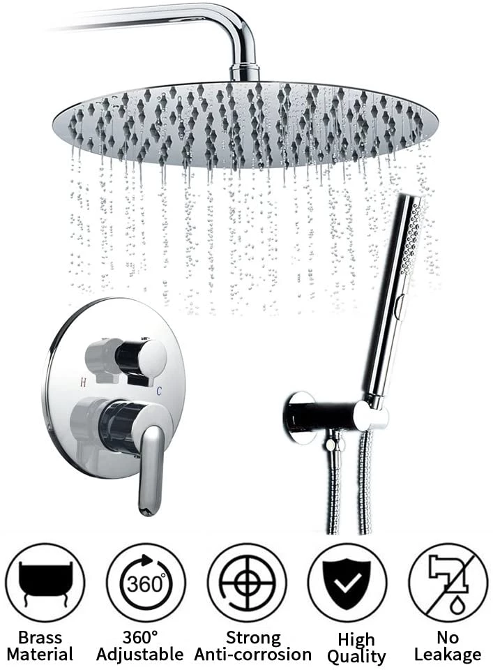 - INCLUDES: 12 inch Square rain shower head (304 stainless steel), handheld shower head (Plastic), 16 inches shower arm (Brass), 1.5M shower hose (304 stainless steel), shower holder (Brass), shower mixer control valve (Brass).