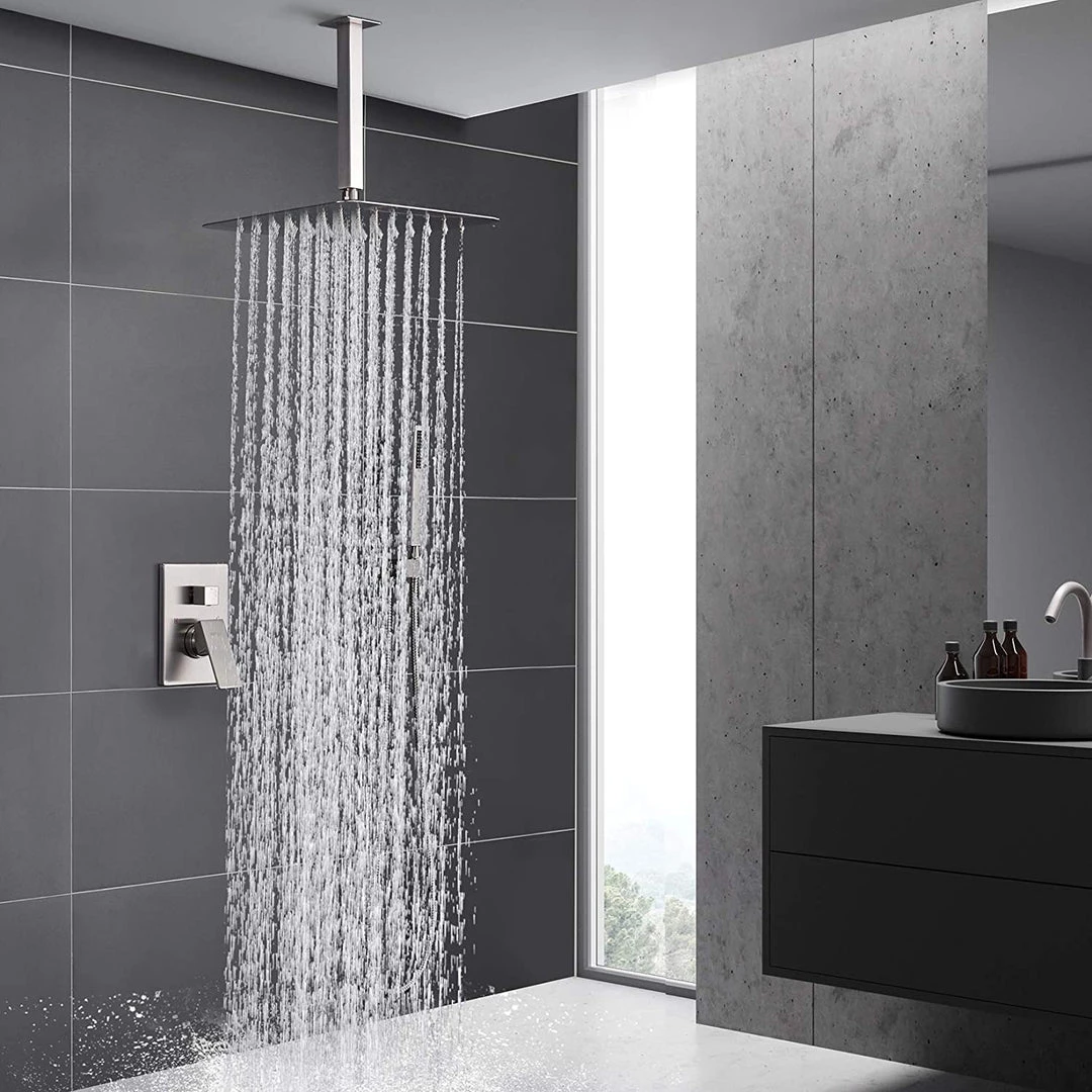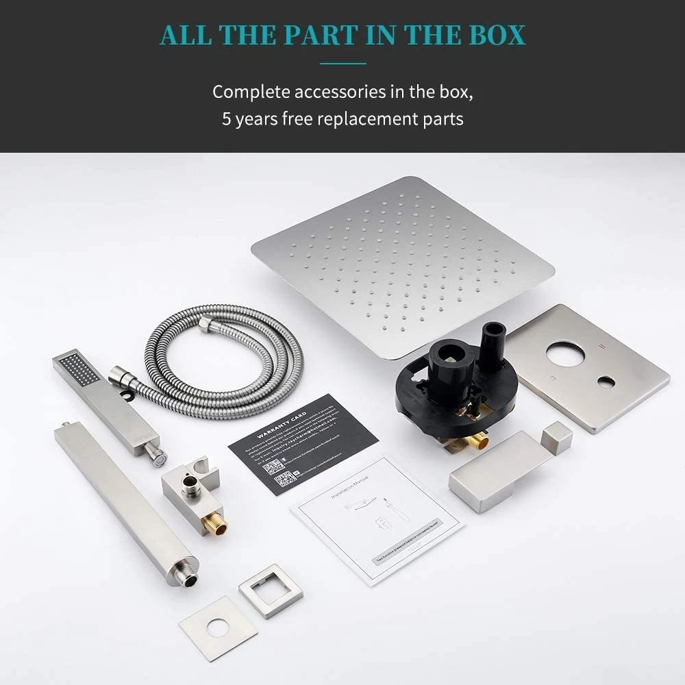 - The shower system include: 12 inch Square rain shower head(304 stainless steel), handheld shower head Brass), 10 inches ceiling shower arm Brass), 1.5M shower hose(304 stainless steel),shower holder Brass), shower mixer valve Brass)