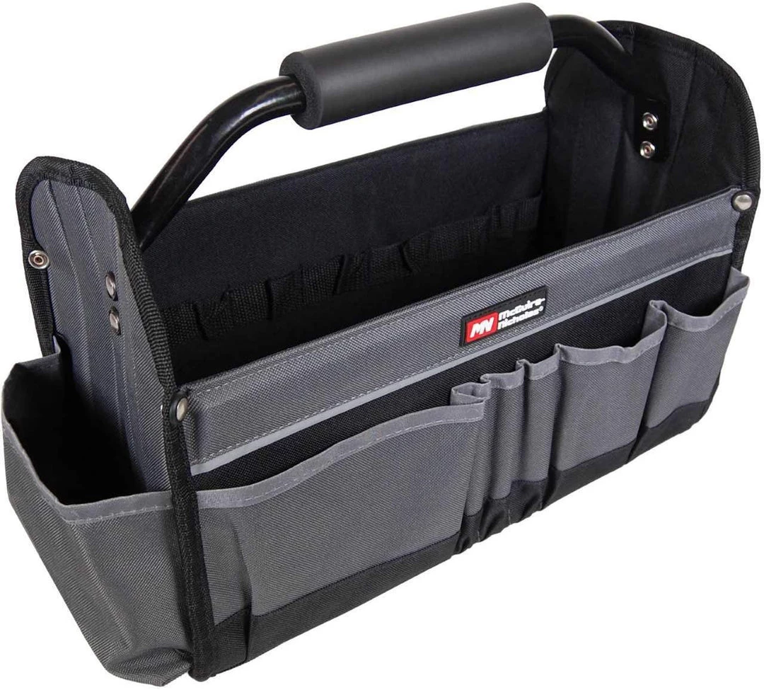 - The Ultimate open tool tote. 14 exterior pockets in various sizes. Tools shown in image are not included