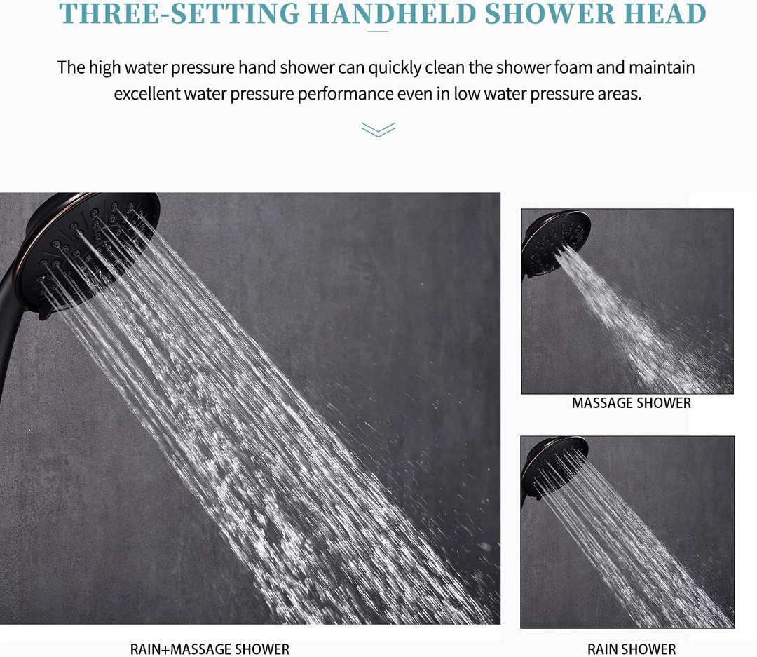 - 3 functions handheld shower head and single function rain shower head,8 inches rain shower head and handheld shower head offer consistent powerful shower even under low water pressure.