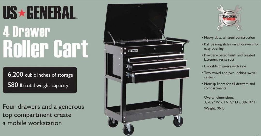 Roller Cart Tool Cabinet Storage Chest Box Glossy Black 4 Drawer 580 Lb. Capacity By US General